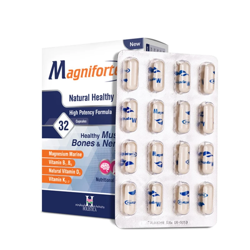 کپسول مگنیفورت مکملی تخصصی حاوی منیزیم دریایی با جذب بالا بههمراه ویتامینهای D3، B1، B6 و K2-7 است که به بهبود عملکرد عضلات و سیستم عصبی کمک میکند. این مکمل برای کاهش گرفتگی و اسپاسم عضلانی، میگرنهای دورهای، علائم PMS و حمایت از سلامت استخوانها کاربرد دارد و به دلیل فرمول فاقد شکر، گلوتن و مواد نگهدارنده، گزینهای مناسب برای مصرف روزانه و طولانیمدت محسوب میشود.