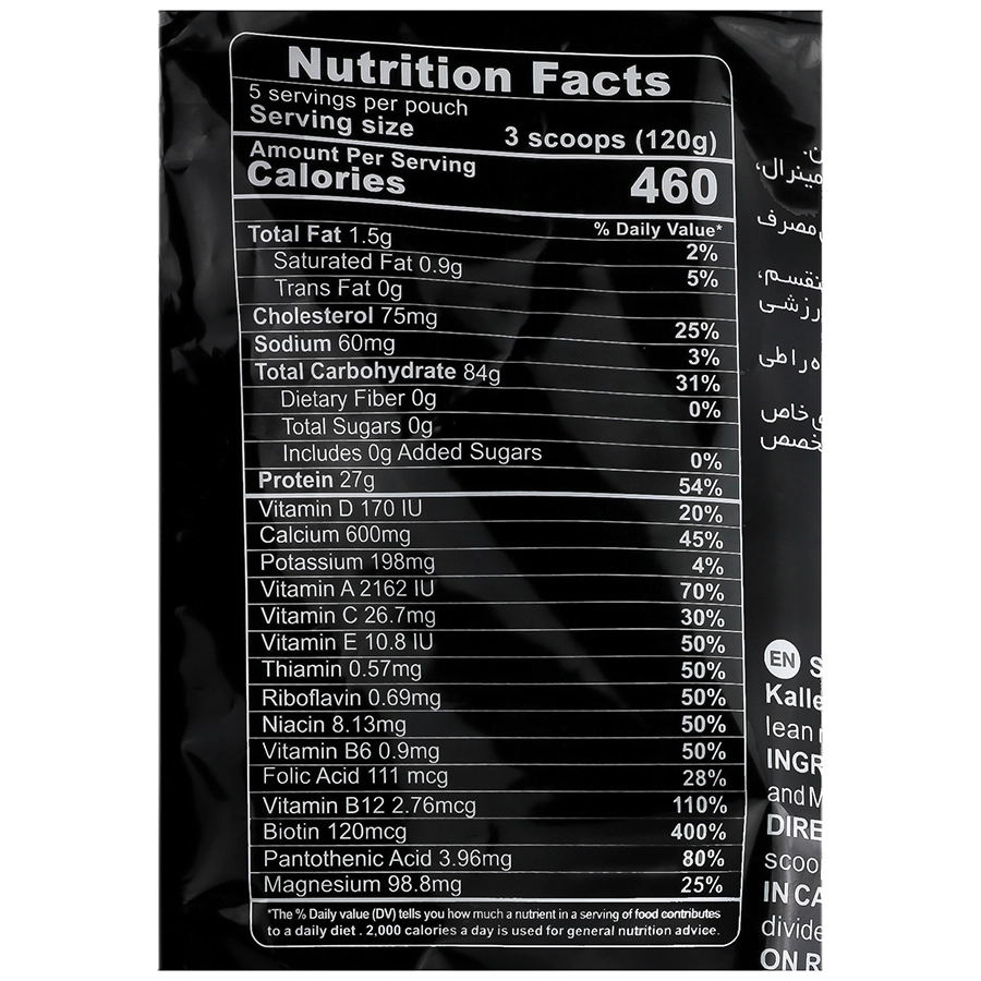 جدول ارزش غذایی (در هر سروینگ) پودر گینر کاله پرو ۶۵۰ گرم عبارتاند از:
