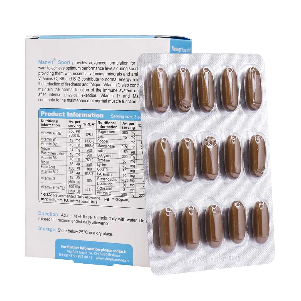 اگر به دنبال یک مولتیویتامین ورزشی مخصوص آقایان هستید که علاوه بر ویتامینها و مینرالها، ترکیبات عملکردی مثل ال آرژنین، ال کارنیتین، CoQ10 و جینسینگ داشته باشد، سافت ژل من ویت اسپورت ویواتیون انتخابی کاربردی برای برنامه تمرینی شماست. این مکمل میتواند در کنار تغذیه صحیح و برنامه تمرینی منظم، به بهبود انرژی روزانه، کاهش خستگی و حمایت از عملکرد عضلات کمک کند.