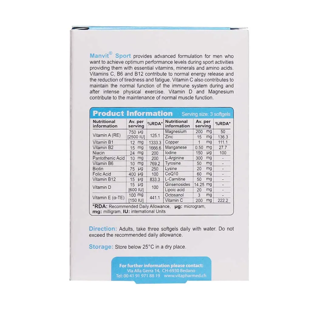 سافت ژل من ویت اسپورت ویواتیون یک مولتیویتامین ورزشی تخصصی برای آقایان است که با ترکیبی از ویتامینها، مواد معدنی و آمینواسیدهایی مانند الـآرژنین و الـکارنیتین، به افزایش انرژی، بهبود عملکرد عضلات، کاهش خستگی و تقویت سیستم ایمنی بدن کمک میکند.